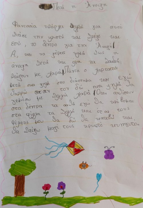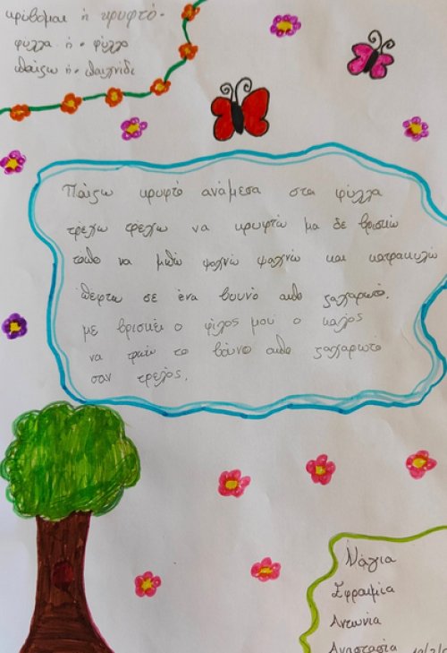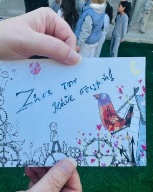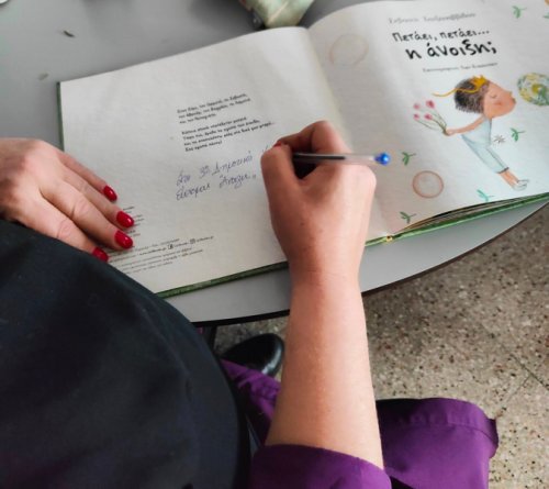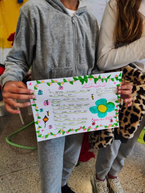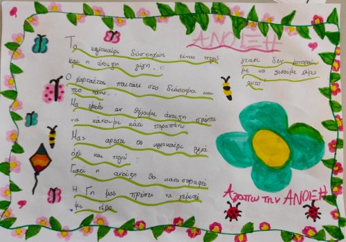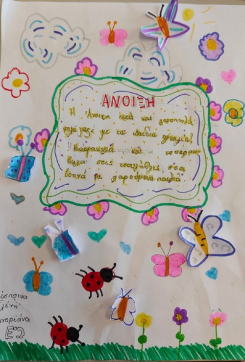 Σέβη μου η Κύπρος σε καλωσορίζει. Ένας μαγικός άνθρωπος που δημιουργεί, με μοναδική αισθητική, στην παρέα μας! Σε μία πρωινή κι Ανοιξιάτικη συνάντηση αναρωτηθήκαμε αν η Άνοιξη πετάει ακόμη, γύρω μας. Αν μας μαγεύει με τους χαρταετούς της, αν μας ταξιδεύει με τα χρώματα, τους ήχους και τα αρώματά της, αν μας ανοίγει την αγκαλιά της για να βρούμε μέσα της "σποράκια" ιδεών και λουλουδιών. Πόσο παρατηρούμε τη φύση γύρω μας; Πόσο απολαμβάνουμε τις μοναδικές της εικόνες και πόσο αφήνουμε την φαντασία μας να απορροφήσει την έμπνευση που μας προσφέρει; Πόσο την ταξιδεύουμε στο σώμα μας κι ακούμε τους χτύπους της καρδιάς της; Η Β' δημοτικού έφτιαξε "διαβατάρικα πουλιά" για να σκορπίσουν λέξεις της Άνοιξης. Η Ε' δημοτικού αναρωτήθηκε αν η Άνοιξη θα ξαναέρθει, αφού την αντιλαμβανόμαστε όλο και λιγότερο. 4 ποιήματα από 4 ομάδες παιδιών βασισμένα σε 3 λέξεις η κάθε μία, μέσα από το κείμενο της Sevi Chatzisavidou έδωσαν την ευκαιρία στη φαντασία των παιδιών να παίξει με τη βαθύτερη έννοια της Άνοιξης και της Αναγέννησης. Για να γνωρίζουν τα παιδιά τα πολύτιμα και να τα διαφυλάτουν. Συγκινητική διάδραση και συμμετοχή από ηλικίες που δύσκολα πια "αγγίζεις" με "αισθήσεις", "συναισθηματική νοημοσύνη" και φύση. Ευγνώμονες! Συγχαρητήρια στις δασκάλες των τμημάτων!